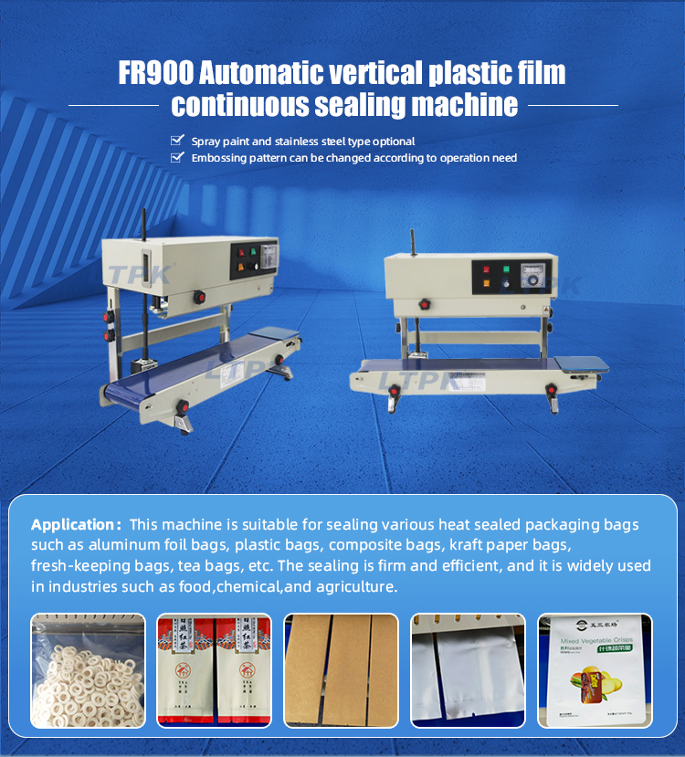 FR900 series automatic plastic film sealing machine adopts electronic constant temperature control and automatic conveying device can control a variety of different shapes of plastic film tape, in a variety of packaging lines supporting the use of sealing length is unlimited.