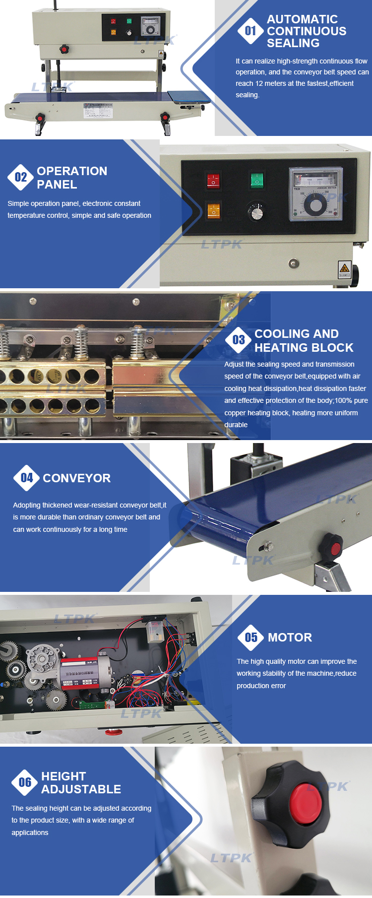 This machine is suitable for sealing various heat sealed packaging bags such as aluminum foil bags, plastic bags, composite bags, kraft paper bags, fresh-keeping bags, tea bags, etc. The sealing is firm and efficient, and it is widely used in industries such as food,chemical,and agriculture.